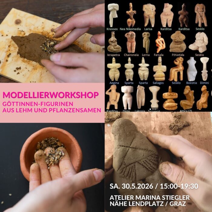 Inspiriert von der Formensprache archäologischer Funde prähistorischer Göttinnenstatuetten aus dem europäischen Raum, werden in diesem Workshop persönliche Figurinen aus Lehm und Pflanzensamen modelliert, die die Teilnehmerinnen stärken, empowern und begleiten sollen. In angenehmer Atmosphäre werden eigene Ressourcen, Fähigkeiten und Intentionen herausgearbeitet und sichtbar gemacht. […]